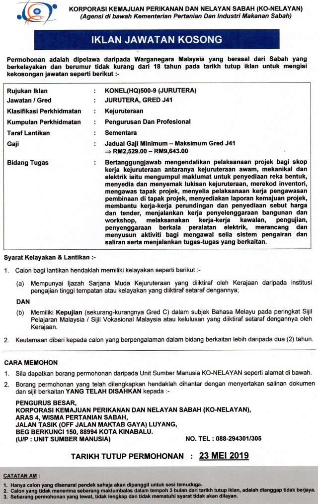 Jawatan Kosong Korporasi Kemajuan Perikanan Dan Nelayan Sabah Ko Nelayan Tarikh Tutup 23 Mei 2019